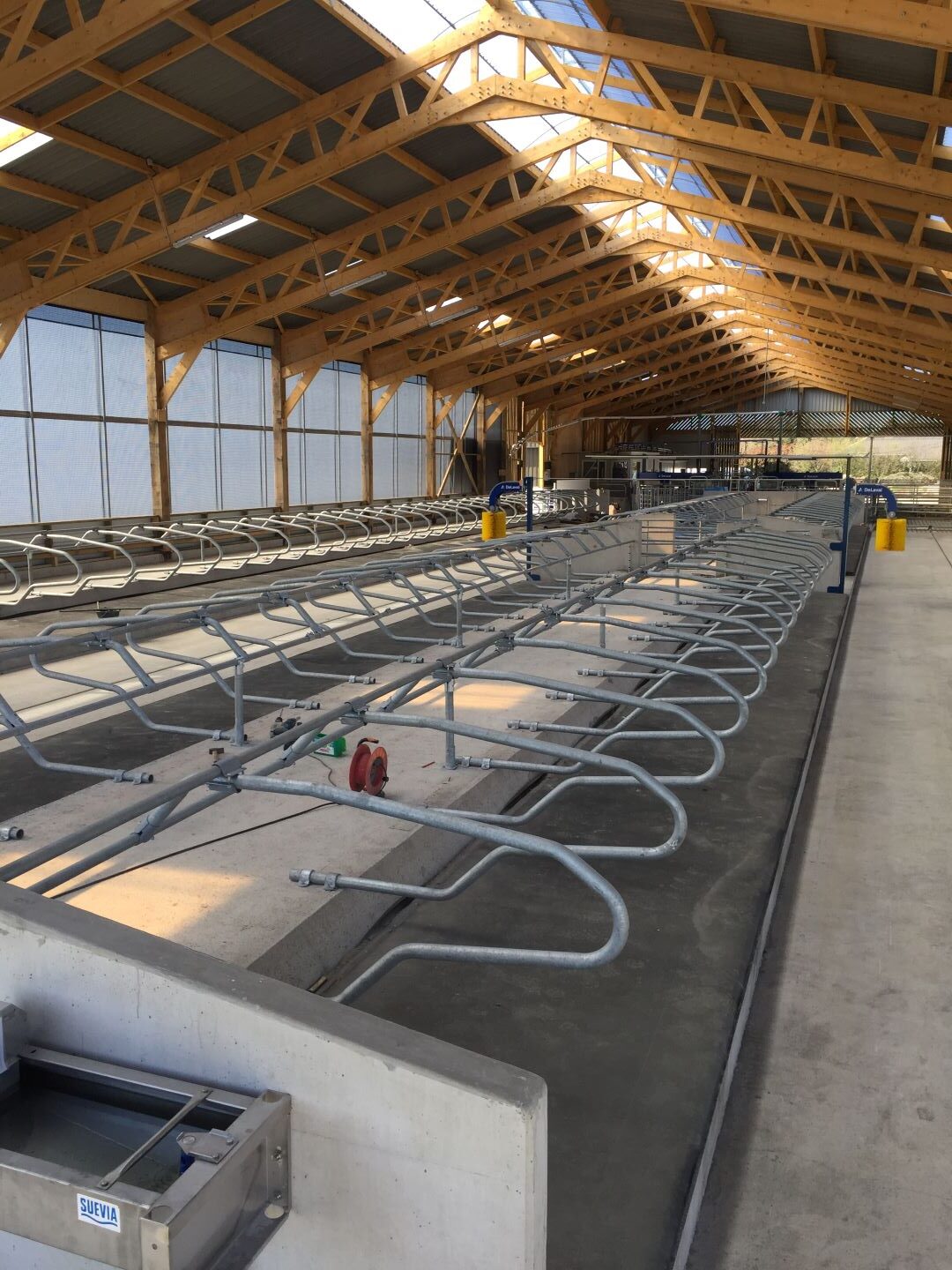 La zone technique, la laiterie, le bureau et les vestiaires-sanitaires sont sur le coté de cette stabulation.